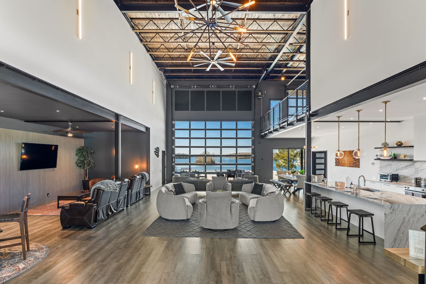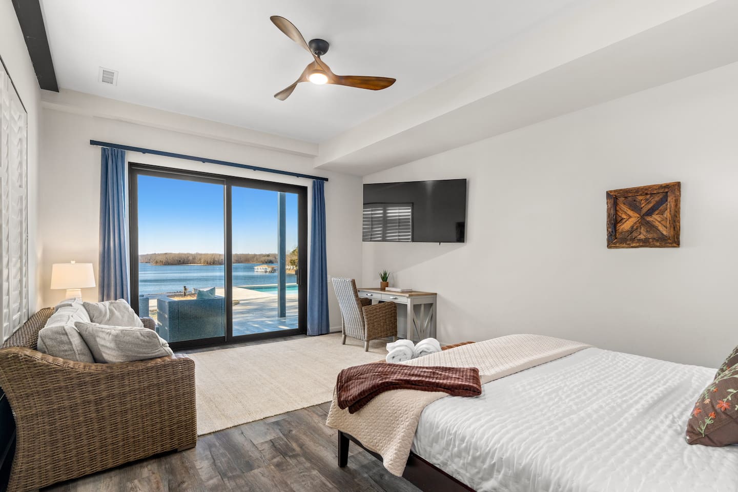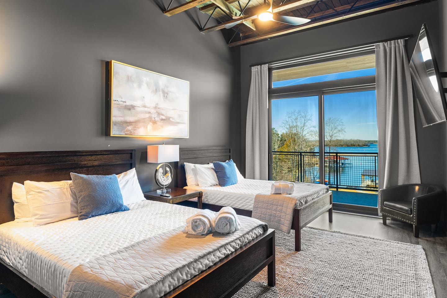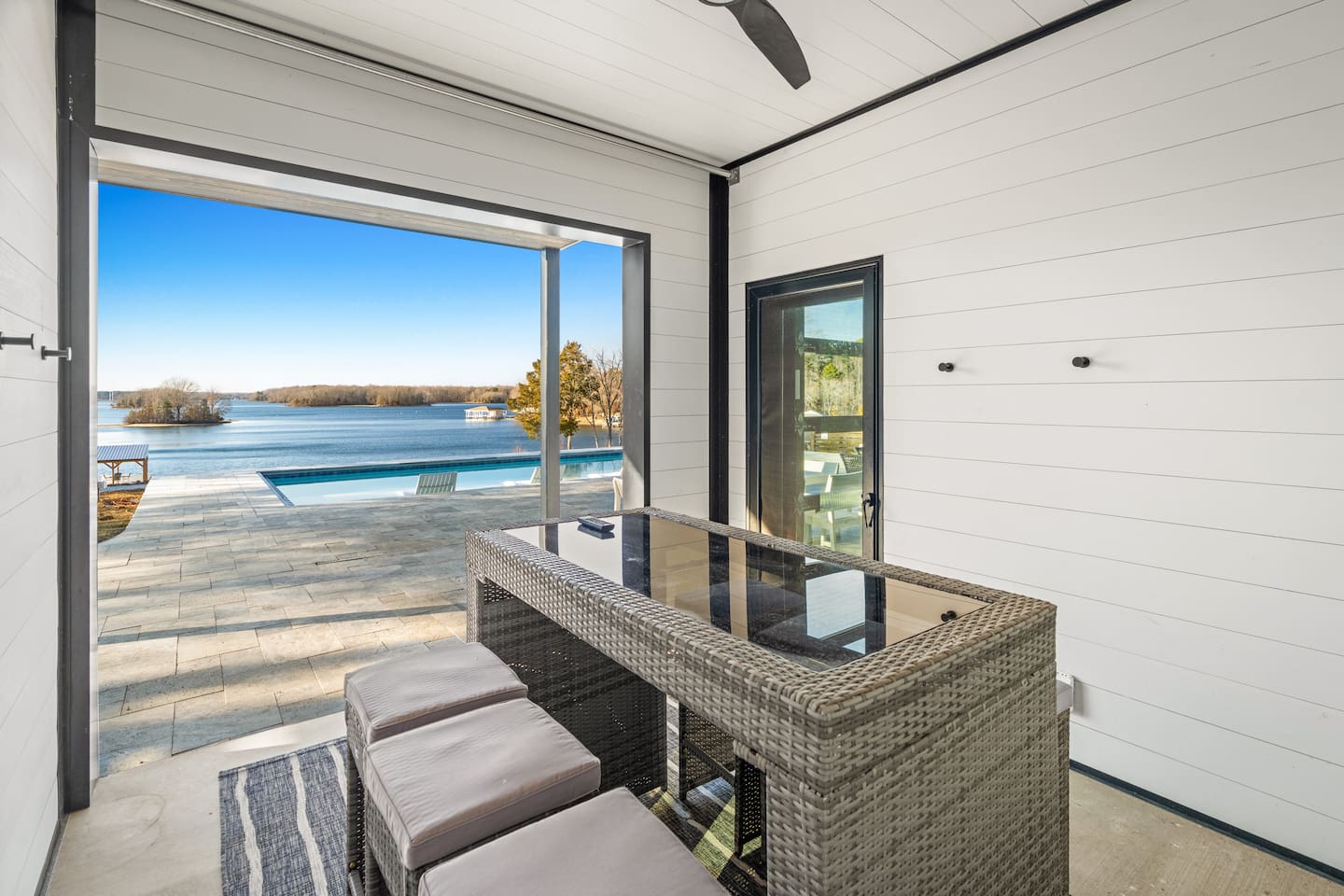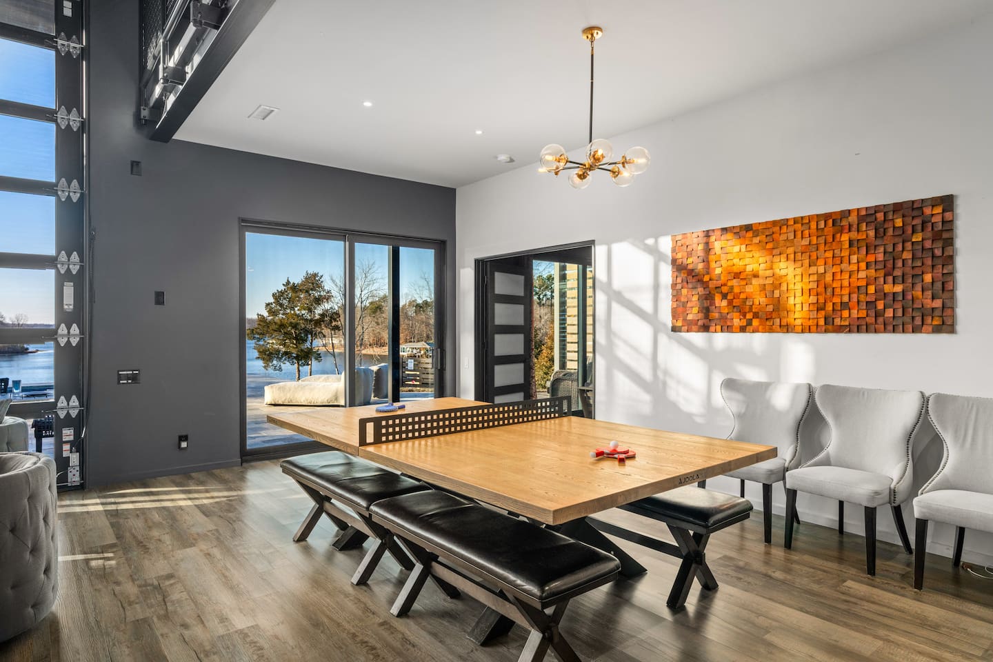 The home layout is as follows: EXTERIOR: - Private infinity pool with loungers both in and out of the water and plenty of tables/chairs for outdoor meals. Pool heat optional for $100+tax/day in spring and fall months. Advance notice required for pool heat. Pool is open April through November. - Swim spa (essentially a massive hot tub), large enough for 15, open year-round - Multiple seating/lounging areas - 2 outdoor TVs - Private beach with sandy water entrance - Private dock. There are a few boat rental companies on the lake if you'd like to have your own pontoon boat for your stay! - Kayaks and paddleboards provided - Wood-burning firepit (not pictured). Firewood provided. - Gas grill (propane is provided) - Large, flat front yard MAIN LEVEL LIVING AREA: - Open concept layout features a massive great room with soaring ceilings and lake views - Multiple conversation areas, as well as a TV viewing area with leather reclining couches - Kitchen features marble counters, premium appliances, and plenty of space - The dining area has a large table that seats 12, plus the nearly bar seats 4, and an additional bar-height table seats another 4. The main dining table can double as a ping pong table. LOFT AREA: - Loft is open to the lower level and features a massive sectional surrounding a big screen TV with video games - Behind the TV area is a full size shuffleboard table (not pictured), and a wet bar with beverage fridge - The balcony off the loft area has the best views of the lake, with bar height seating to take in the sunsets - Laundry room is also in this area of the home BEDROOMS / BATHROOMS: - BR1: Main level king with seating area and ensuite bath. Room faces the lake and has a patio. - BR2: Main level king with additional couch and ensuite bath. Room faces the lake and has a patio. - BR3: Main level queen with ensuite bath. Room faces front yard and has a patio. - BR4: Upstairs king with ensuite bath. Room faces front yard and has a private balcony. - BR5: Upstairs king with ensuite bath. Room faces the lake and shares a balcony with BR6. - BR6: Upstairs 2 queen bedroom with ensuite bath. Room faces the lake and shares a balcony with BR5. *Note: photos show 1 queen with seating area... room now has 2 queens and no additional seating area - BR7: Upstairs bedroom with queen bed plus a twin-over-twin bunk bed. Adjoining full bathroom also has an entrance to hallway to service loft area. Private balcony overlooking front yard. - BR8: Main level room near kitchen with sofa bed. Adjoining full bathroom also services main living space. Faces front yard and has patio. *IMPORTANT: this room is has a curtain, not a door, and thus is not completely private.