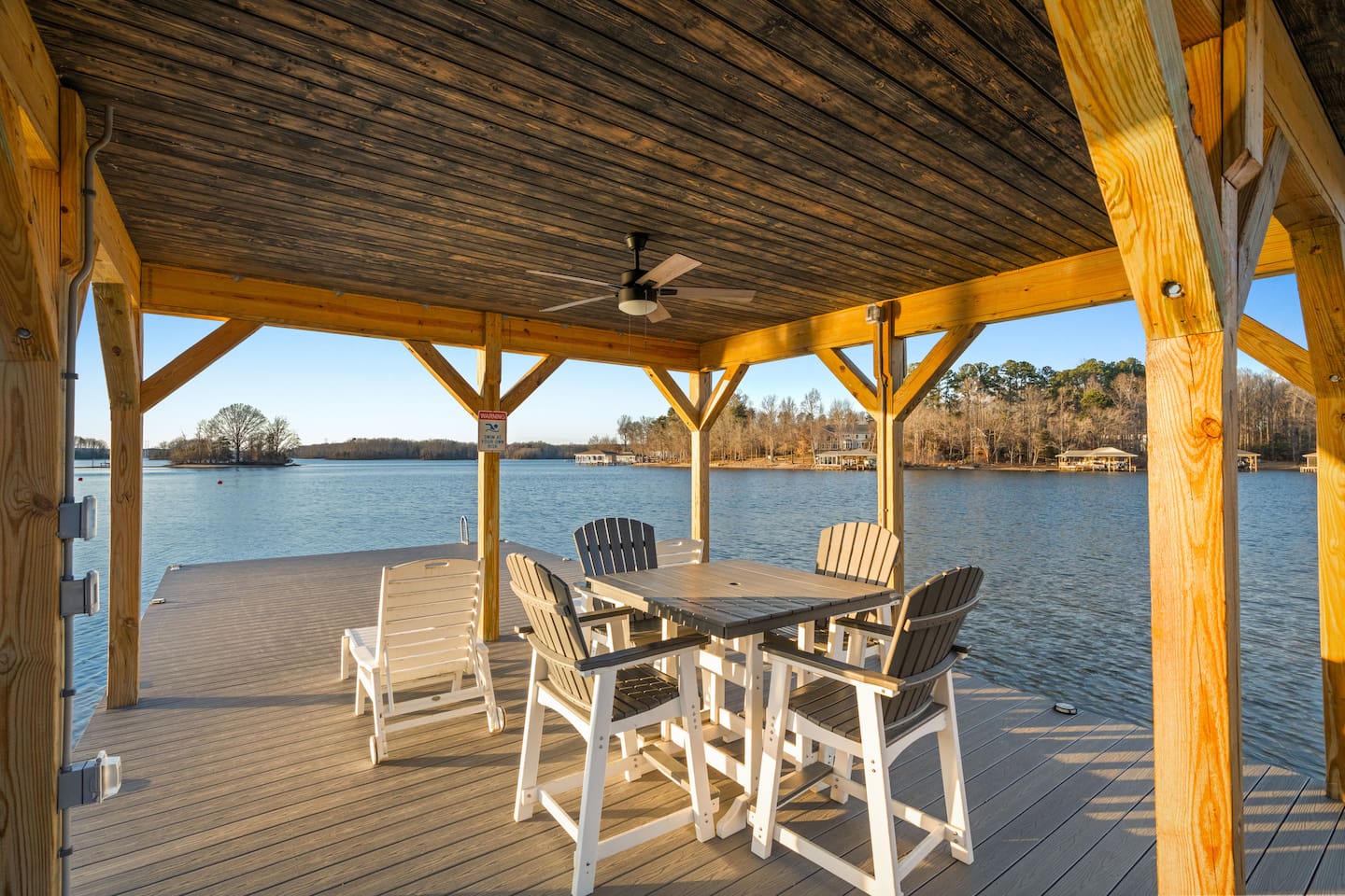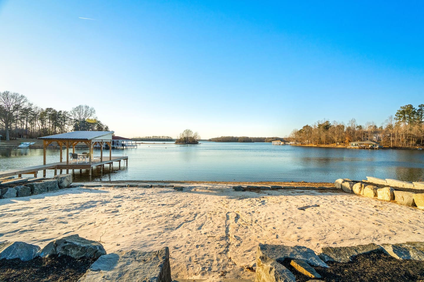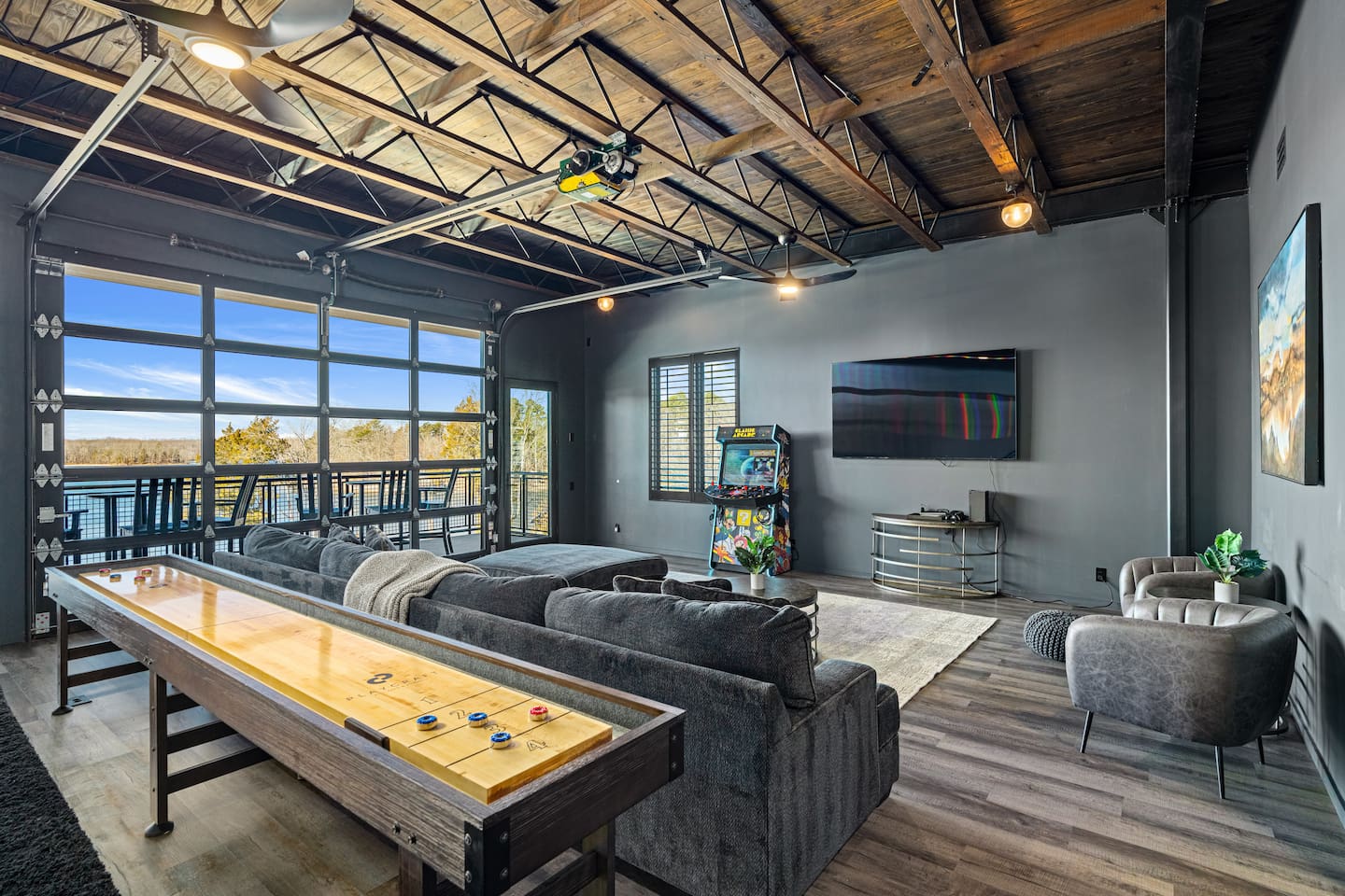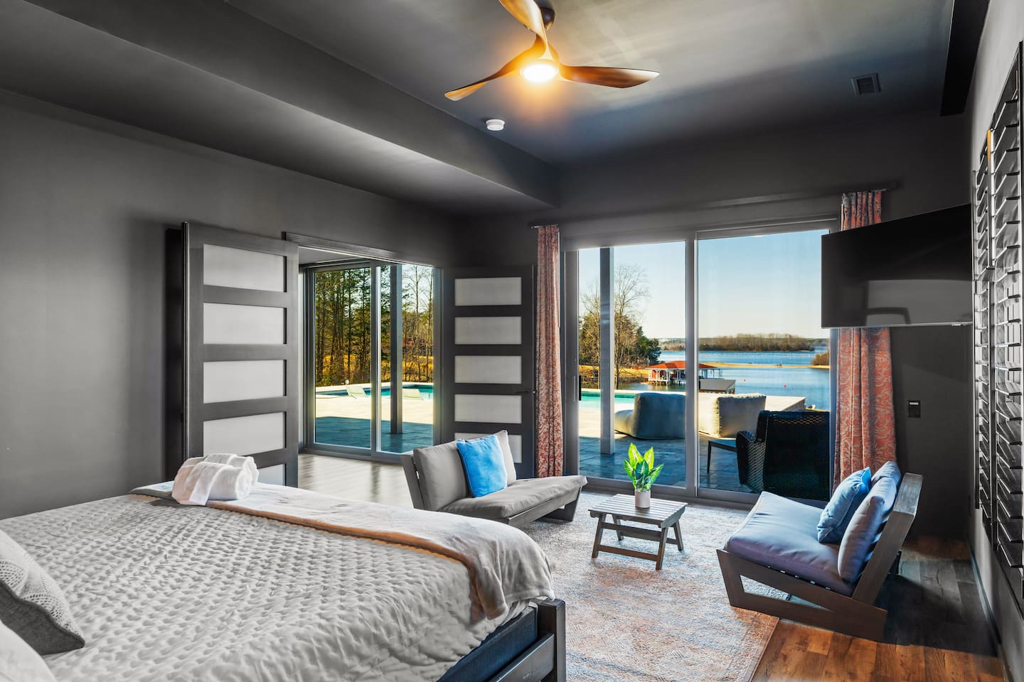 The home layout is as follows: EXTERIOR: - Private infinity pool with loungers both in and out of the water and plenty of tables/chairs for outdoor meals. Pool heat optional for $100+tax/day in spring and fall months. Advance notice required for pool heat. Pool is open April through November. - Swim spa (essentially a massive hot tub), large enough for 15, open year-round - Multiple seating/lounging areas - 2 outdoor TVs - Private beach with sandy water entrance - Private dock. There are a few boat rental companies on the lake if you'd like to have your own pontoon boat for your stay! - Kayaks and paddleboards provided - Wood-burning firepit (not pictured). Firewood provided. - Gas grill (propane is provided) - Large, flat front yard MAIN LEVEL LIVING AREA: - Open concept layout features a massive great room with soaring ceilings and lake views - Multiple conversation areas, as well as a TV viewing area with leather reclining couches - Kitchen features marble counters, premium appliances, and plenty of space - The dining area has a large table that seats 12, plus the nearly bar seats 4, and an additional bar-height table seats another 4. The main dining table can double as a ping pong table. LOFT AREA: - Loft is open to the lower level and features a massive sectional surrounding a big screen TV with video games - Behind the TV area is a full size shuffleboard table (not pictured), and a wet bar with beverage fridge - The balcony off the loft area has the best views of the lake, with bar height seating to take in the sunsets - Laundry room is also in this area of the home BEDROOMS / BATHROOMS: - BR1: Main level king with seating area and ensuite bath. Room faces the lake and has a patio. - BR2: Main level king with additional couch and ensuite bath. Room faces the lake and has a patio. - BR3: Main level queen with ensuite bath. Room faces front yard and has a patio. - BR4: Upstairs king with ensuite bath. Room faces front yard and has a private balcony. - BR5: Upstairs king with ensuite bath. Room faces the lake and shares a balcony with BR6. - BR6: Upstairs 2 queen bedroom with ensuite bath. Room faces the lake and shares a balcony with BR5. *Note: photos show 1 queen with seating area... room now has 2 queens and no additional seating area - BR7: Upstairs bedroom with queen bed plus a twin-over-twin bunk bed. Adjoining full bathroom also has an entrance to hallway to service loft area. Private balcony overlooking front yard. - BR8: Main level room near kitchen with sofa bed. Adjoining full bathroom also services main living space. Faces front yard and has patio. *IMPORTANT: this room is has a curtain, not a door, and thus is not completely private.