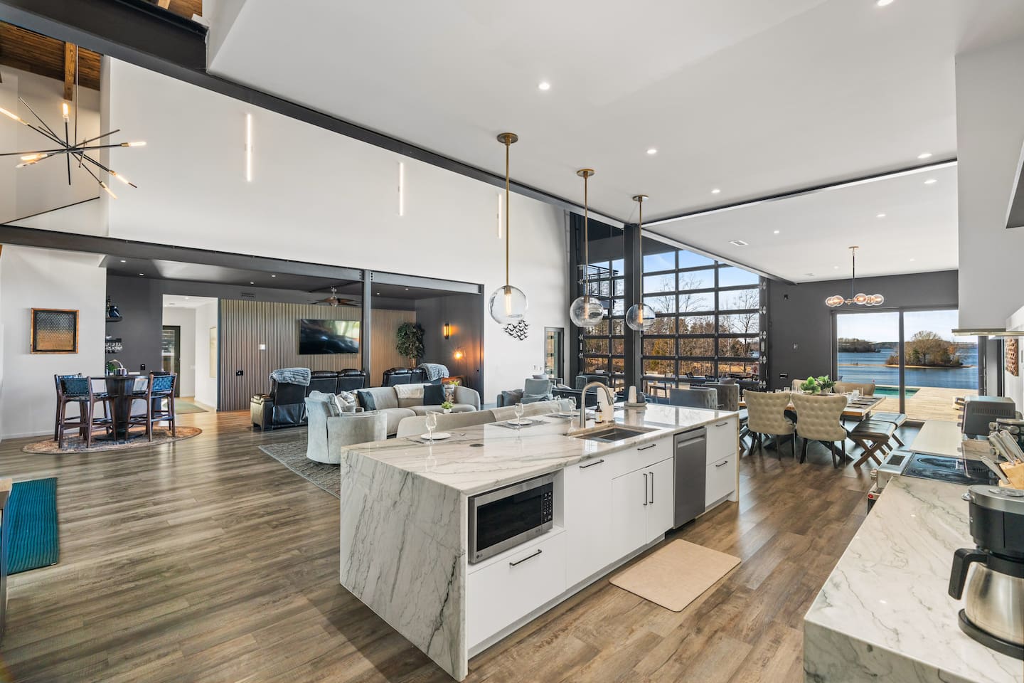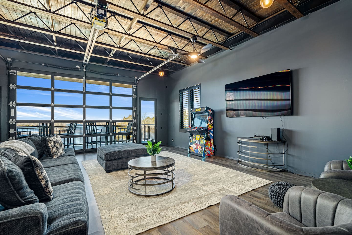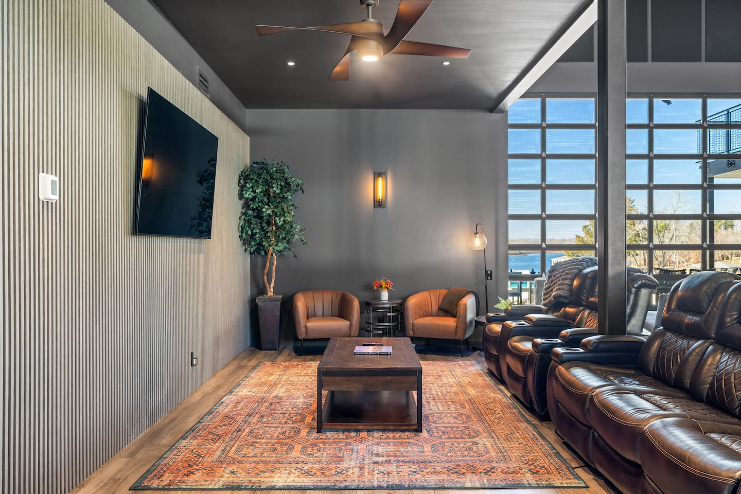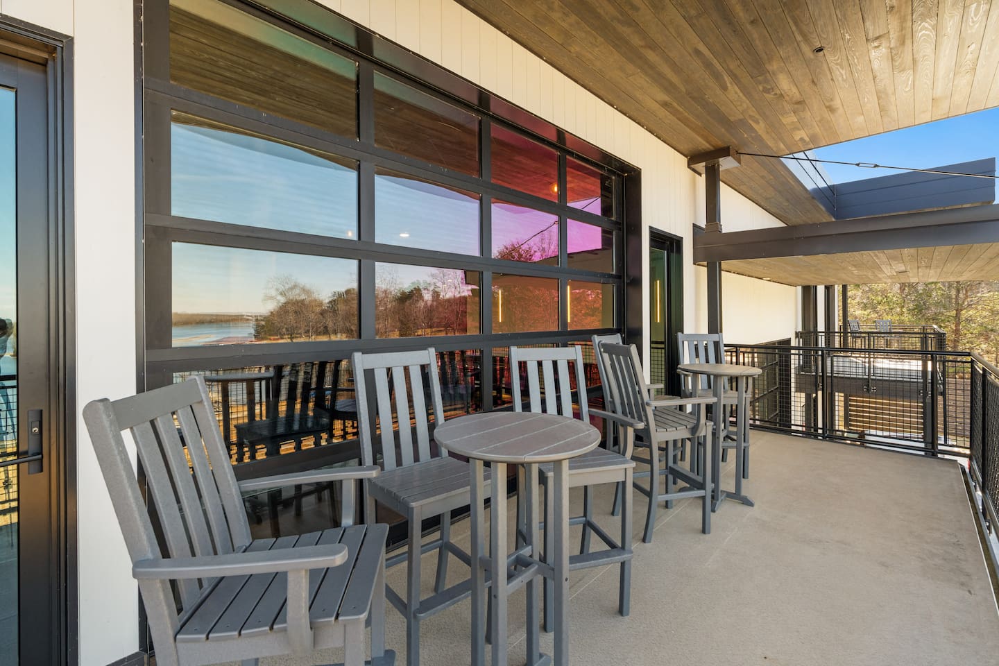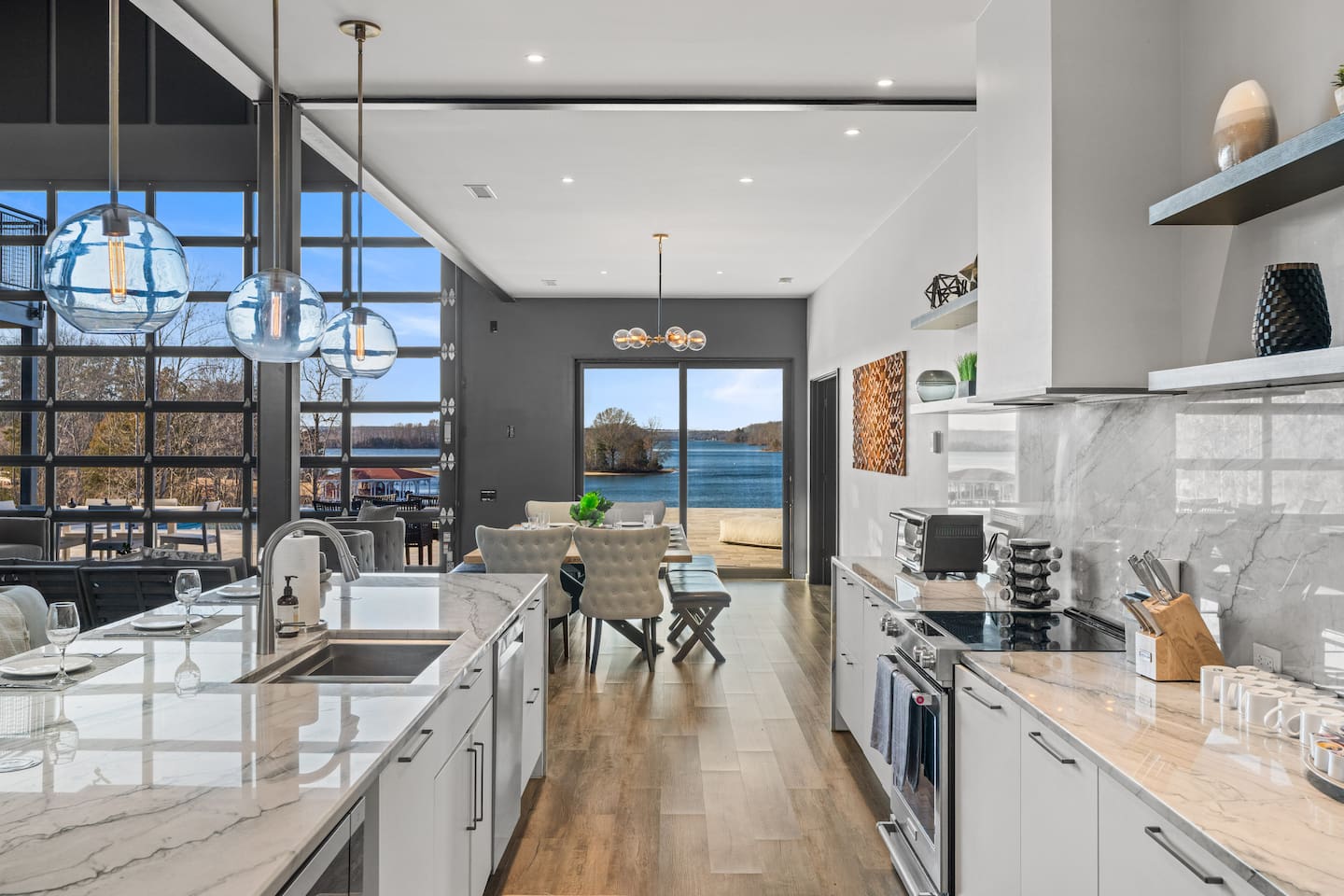 The home layout is as follows: EXTERIOR: - Private infinity pool with loungers both in and out of the water and plenty of tables/chairs for outdoor meals. Pool heat optional for $100+tax/day in spring and fall months. Advance notice required for pool heat. Pool is open April through November. - Swim spa (essentially a massive hot tub), large enough for 15, open year-round - Multiple seating/lounging areas - 2 outdoor TVs - Private beach with sandy water entrance - Private dock. There are a few boat rental companies on the lake if you'd like to have your own pontoon boat for your stay! - Kayaks and paddleboards provided - Wood-burning firepit (not pictured). Firewood provided. - Gas grill (propane is provided) - Large, flat front yard MAIN LEVEL LIVING AREA: - Open concept layout features a massive great room with soaring ceilings and lake views - Multiple conversation areas, as well as a TV viewing area with leather reclining couches - Kitchen features marble counters, premium appliances, and plenty of space - The dining area has a large table that seats 12, plus the nearly bar seats 4, and an additional bar-height table seats another 4. The main dining table can double as a ping pong table. LOFT AREA: - Loft is open to the lower level and features a massive sectional surrounding a big screen TV with video games - Behind the TV area is a full size shuffleboard table (not pictured), and a wet bar with beverage fridge - The balcony off the loft area has the best views of the lake, with bar height seating to take in the sunsets - Laundry room is also in this area of the home BEDROOMS / BATHROOMS: - BR1: Main level king with seating area and ensuite bath. Room faces the lake and has a patio. - BR2: Main level king with additional couch and ensuite bath. Room faces the lake and has a patio. - BR3: Main level queen with ensuite bath. Room faces front yard and has a patio. - BR4: Upstairs king with ensuite bath. Room faces front yard and has a private balcony. - BR5: Upstairs king with ensuite bath. Room faces the lake and shares a balcony with BR6. - BR6: Upstairs 2 queen bedroom with ensuite bath. Room faces the lake and shares a balcony with BR5. *Note: photos show 1 queen with seating area... room now has 2 queens and no additional seating area - BR7: Upstairs bedroom with queen bed plus a twin-over-twin bunk bed. Adjoining full bathroom also has an entrance to hallway to service loft area. Private balcony overlooking front yard. - BR8: Main level room near kitchen with sofa bed. Adjoining full bathroom also services main living space. Faces front yard and has patio. *IMPORTANT: this room is has a curtain, not a door, and thus is not completely private.