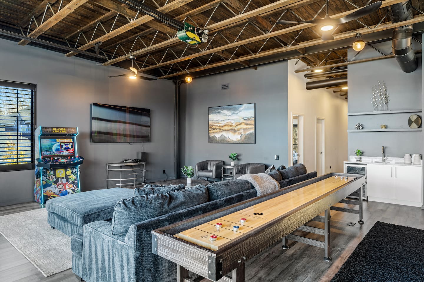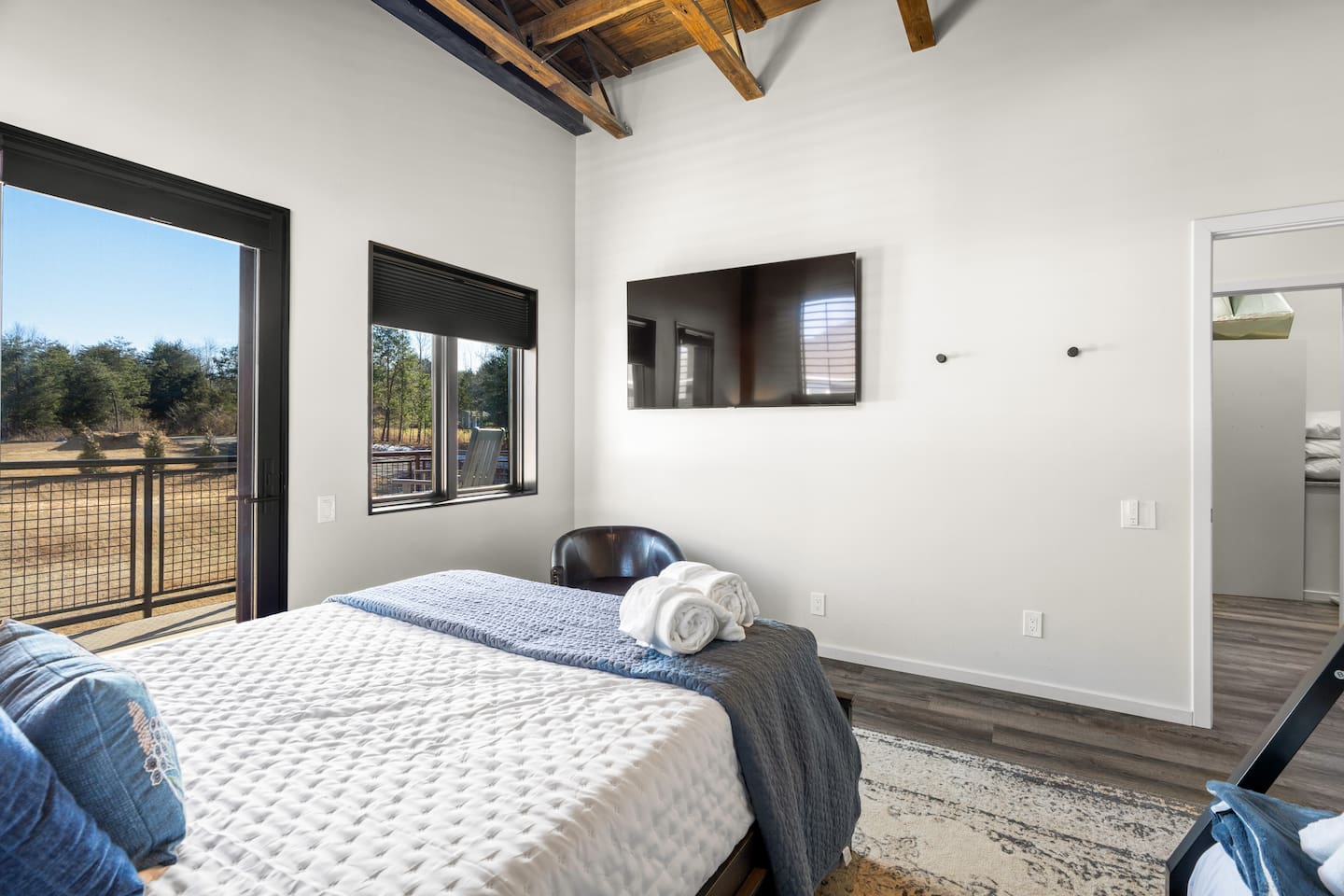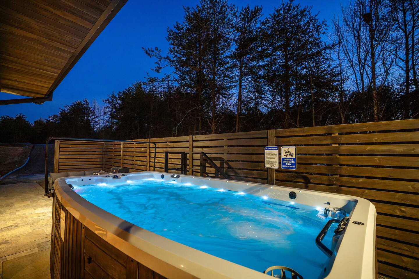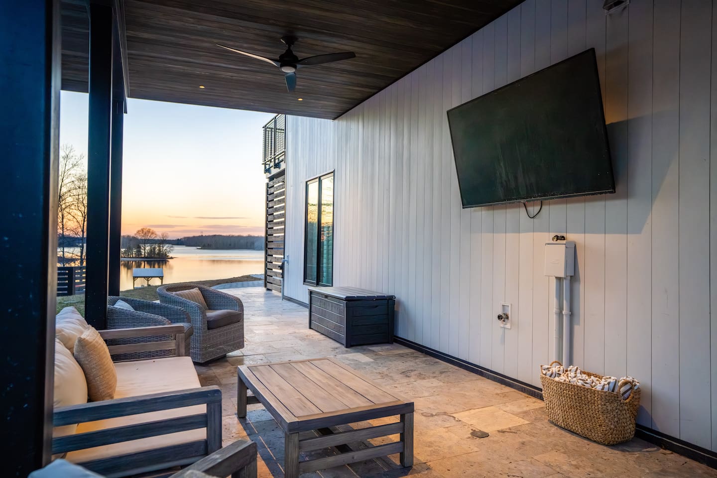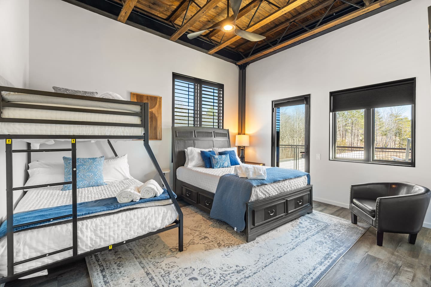 The home layout is as follows: EXTERIOR: - Private infinity pool with loungers both in and out of the water and plenty of tables/chairs for outdoor meals. Pool heat optional for $100+tax/day in spring and fall months. Advance notice required for pool heat. Pool is open April through November. - Swim spa (essentially a massive hot tub), large enough for 15, open year-round - Multiple seating/lounging areas - 2 outdoor TVs - Private beach with sandy water entrance - Private dock. There are a few boat rental companies on the lake if you'd like to have your own pontoon boat for your stay! - Kayaks and paddleboards provided - Wood-burning firepit (not pictured). Firewood provided. - Gas grill (propane is provided) - Large, flat front yard MAIN LEVEL LIVING AREA: - Open concept layout features a massive great room with soaring ceilings and lake views - Multiple conversation areas, as well as a TV viewing area with leather reclining couches - Kitchen features marble counters, premium appliances, and plenty of space - The dining area has a large table that seats 12, plus the nearly bar seats 4, and an additional bar-height table seats another 4. The main dining table can double as a ping pong table. LOFT AREA: - Loft is open to the lower level and features a massive sectional surrounding a big screen TV with video games - Behind the TV area is a full size shuffleboard table (not pictured), and a wet bar with beverage fridge - The balcony off the loft area has the best views of the lake, with bar height seating to take in the sunsets - Laundry room is also in this area of the home BEDROOMS / BATHROOMS: - BR1: Main level king with seating area and ensuite bath. Room faces the lake and has a patio. - BR2: Main level king with additional couch and ensuite bath. Room faces the lake and has a patio. - BR3: Main level queen with ensuite bath. Room faces front yard and has a patio. - BR4: Upstairs king with ensuite bath. Room faces front yard and has a private balcony. - BR5: Upstairs king with ensuite bath. Room faces the lake and shares a balcony with BR6. - BR6: Upstairs 2 queen bedroom with ensuite bath. Room faces the lake and shares a balcony with BR5. *Note: photos show 1 queen with seating area... room now has 2 queens and no additional seating area - BR7: Upstairs bedroom with queen bed plus a twin-over-twin bunk bed. Adjoining full bathroom also has an entrance to hallway to service loft area. Private balcony overlooking front yard. - BR8: Main level room near kitchen with sofa bed. Adjoining full bathroom also services main living space. Faces front yard and has patio. *IMPORTANT: this room is has a curtain, not a door, and thus is not completely private.