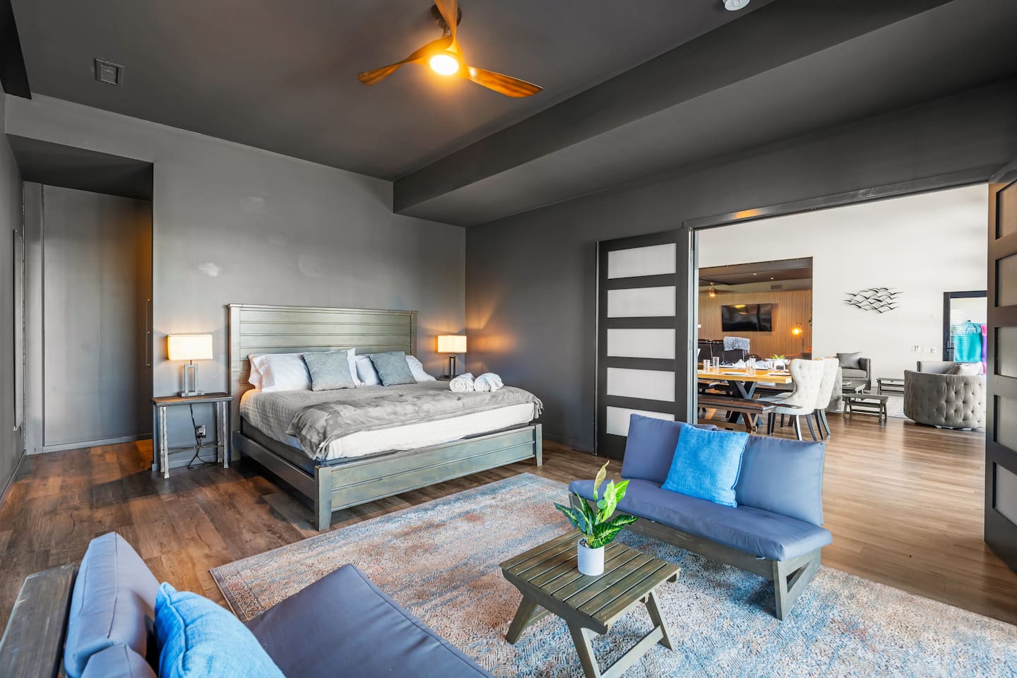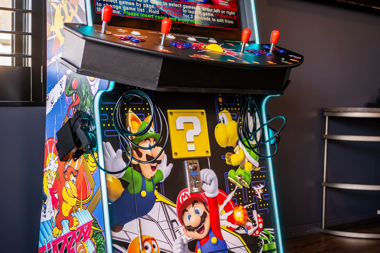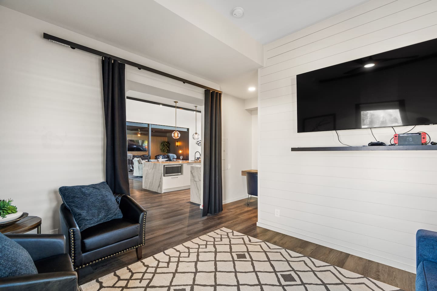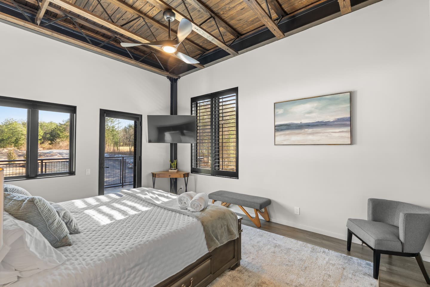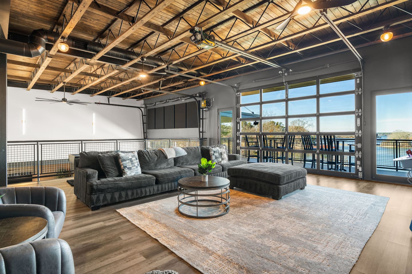 The home layout is as follows: EXTERIOR: - Private infinity pool with loungers both in and out of the water and plenty of tables/chairs for outdoor meals. Pool heat optional for $100+tax/day in spring and fall months. Advance notice required for pool heat. Pool is open April through November. - Swim spa (essentially a massive hot tub), large enough for 15, open year-round - Multiple seating/lounging areas - 2 outdoor TVs - Private beach with sandy water entrance - Private dock. There are a few boat rental companies on the lake if you'd like to have your own pontoon boat for your stay! - Kayaks and paddleboards provided - Wood-burning firepit (not pictured). Firewood provided. - Gas grill (propane is provided) - Large, flat front yard MAIN LEVEL LIVING AREA: - Open concept layout features a massive great room with soaring ceilings and lake views - Multiple conversation areas, as well as a TV viewing area with leather reclining couches - Kitchen features marble counters, premium appliances, and plenty of space - The dining area has a large table that seats 12, plus the nearly bar seats 4, and an additional bar-height table seats another 4. The main dining table can double as a ping pong table. LOFT AREA: - Loft is open to the lower level and features a massive sectional surrounding a big screen TV with video games - Behind the TV area is a full size shuffleboard table (not pictured), and a wet bar with beverage fridge - The balcony off the loft area has the best views of the lake, with bar height seating to take in the sunsets - Laundry room is also in this area of the home BEDROOMS / BATHROOMS: - BR1: Main level king with seating area and ensuite bath. Room faces the lake and has a patio. - BR2: Main level king with additional couch and ensuite bath. Room faces the lake and has a patio. - BR3: Main level queen with ensuite bath. Room faces front yard and has a patio. - BR4: Upstairs king with ensuite bath. Room faces front yard and has a private balcony. - BR5: Upstairs king with ensuite bath. Room faces the lake and shares a balcony with BR6. - BR6: Upstairs 2 queen bedroom with ensuite bath. Room faces the lake and shares a balcony with BR5. *Note: photos show 1 queen with seating area... room now has 2 queens and no additional seating area - BR7: Upstairs bedroom with queen bed plus a twin-over-twin bunk bed. Adjoining full bathroom also has an entrance to hallway to service loft area. Private balcony overlooking front yard. - BR8: Main level room near kitchen with sofa bed. Adjoining full bathroom also services main living space. Faces front yard and has patio. *IMPORTANT: this room is has a curtain, not a door, and thus is not completely private.