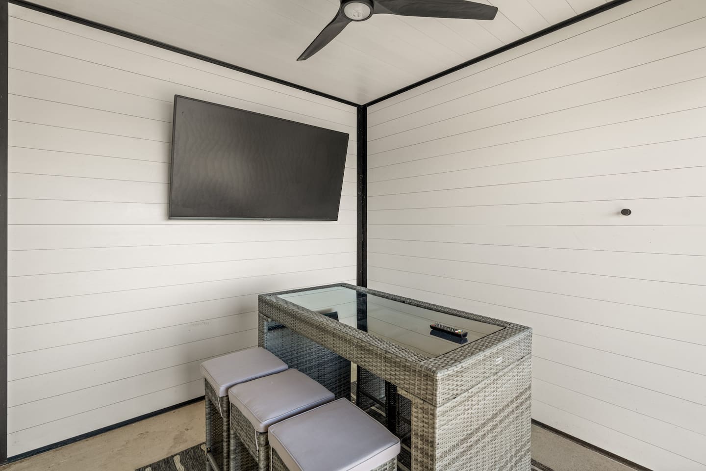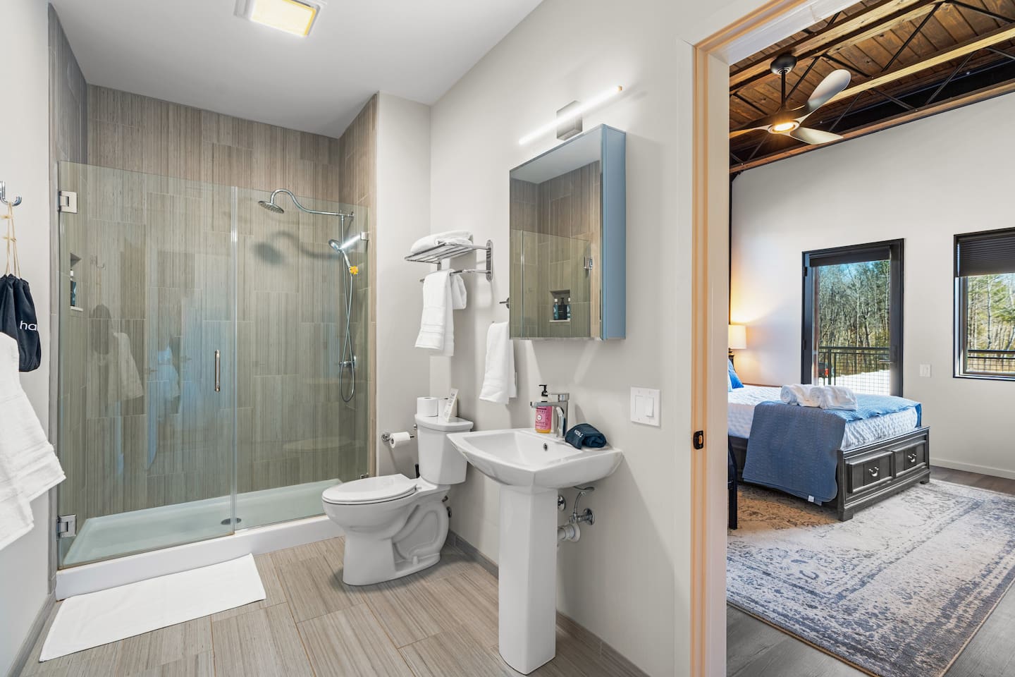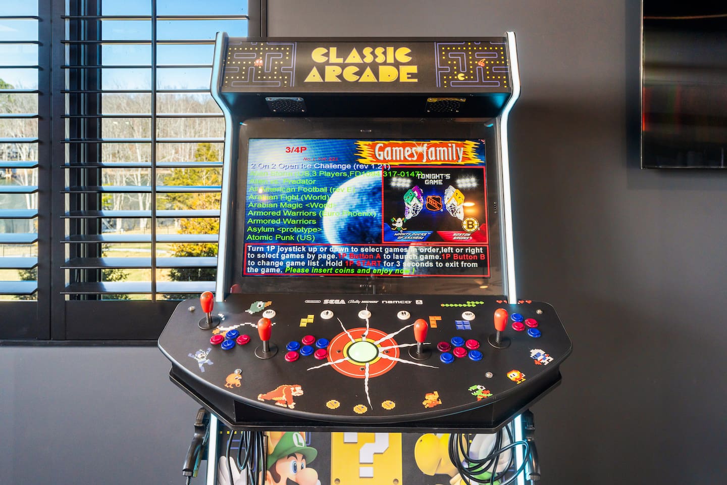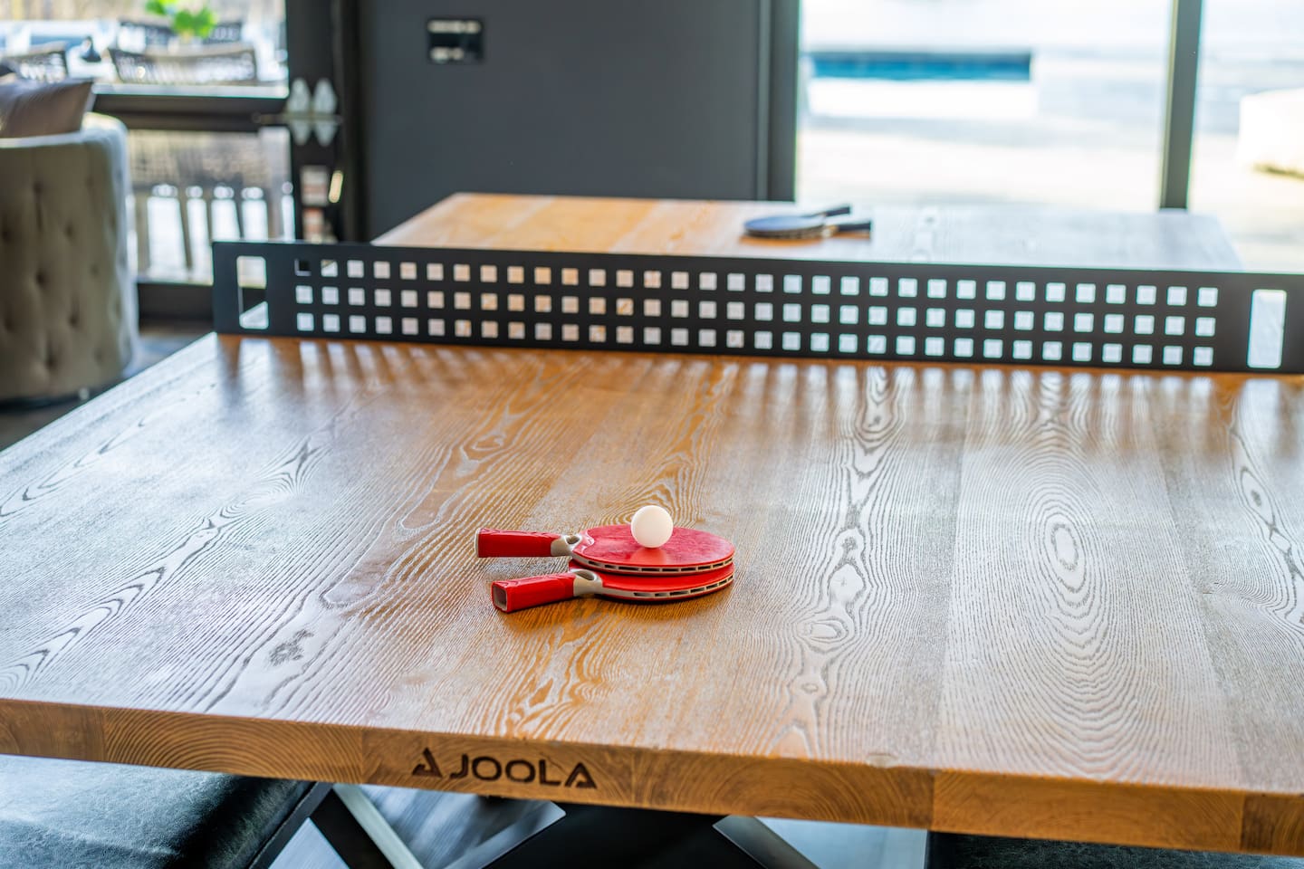 The home layout is as follows: EXTERIOR: - Private infinity pool with loungers both in and out of the water and plenty of tables/chairs for outdoor meals. Pool heat optional for $100+tax/day in spring and fall months. Advance notice required for pool heat. Pool is open April through November. - Swim spa (essentially a massive hot tub), large enough for 15, open year-round - Multiple seating/lounging areas - 2 outdoor TVs - Private beach with sandy water entrance - Private dock. There are a few boat rental companies on the lake if you'd like to have your own pontoon boat for your stay! - Kayaks and paddleboards provided - Wood-burning firepit (not pictured). Firewood provided. - Gas grill (propane is provided) - Large, flat front yard MAIN LEVEL LIVING AREA: - Open concept layout features a massive great room with soaring ceilings and lake views - Multiple conversation areas, as well as a TV viewing area with leather reclining couches - Kitchen features marble counters, premium appliances, and plenty of space - The dining area has a large table that seats 12, plus the nearly bar seats 4, and an additional bar-height table seats another 4. The main dining table can double as a ping pong table. LOFT AREA: - Loft is open to the lower level and features a massive sectional surrounding a big screen TV with video games - Behind the TV area is a full size shuffleboard table (not pictured), and a wet bar with beverage fridge - The balcony off the loft area has the best views of the lake, with bar height seating to take in the sunsets - Laundry room is also in this area of the home BEDROOMS / BATHROOMS: - BR1: Main level king with seating area and ensuite bath. Room faces the lake and has a patio. - BR2: Main level king with additional couch and ensuite bath. Room faces the lake and has a patio. - BR3: Main level queen with ensuite bath. Room faces front yard and has a patio. - BR4: Upstairs king with ensuite bath. Room faces front yard and has a private balcony. - BR5: Upstairs king with ensuite bath. Room faces the lake and shares a balcony with BR6. - BR6: Upstairs 2 queen bedroom with ensuite bath. Room faces the lake and shares a balcony with BR5. *Note: photos show 1 queen with seating area... room now has 2 queens and no additional seating area - BR7: Upstairs bedroom with queen bed plus a twin-over-twin bunk bed. Adjoining full bathroom also has an entrance to hallway to service loft area. Private balcony overlooking front yard. - BR8: Main level room near kitchen with sofa bed. Adjoining full bathroom also services main living space. Faces front yard and has patio. *IMPORTANT: this room is has a curtain, not a door, and thus is not completely private.